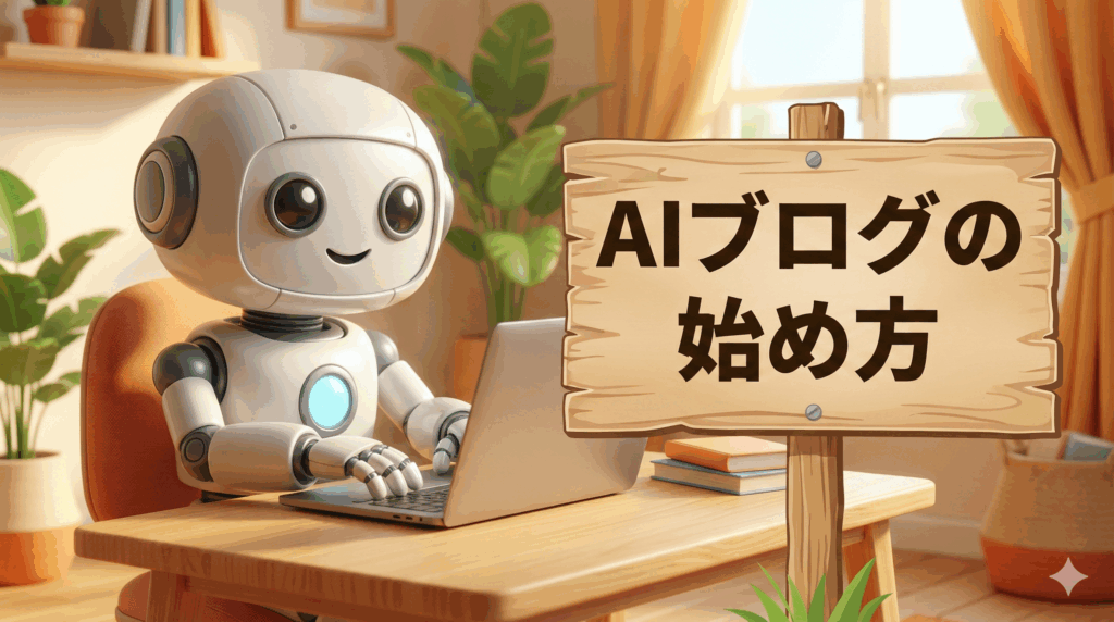 ・その看板には**「AIブログの始め方」**という日本語のテキストが、はっきりと太文字で書かれている。
