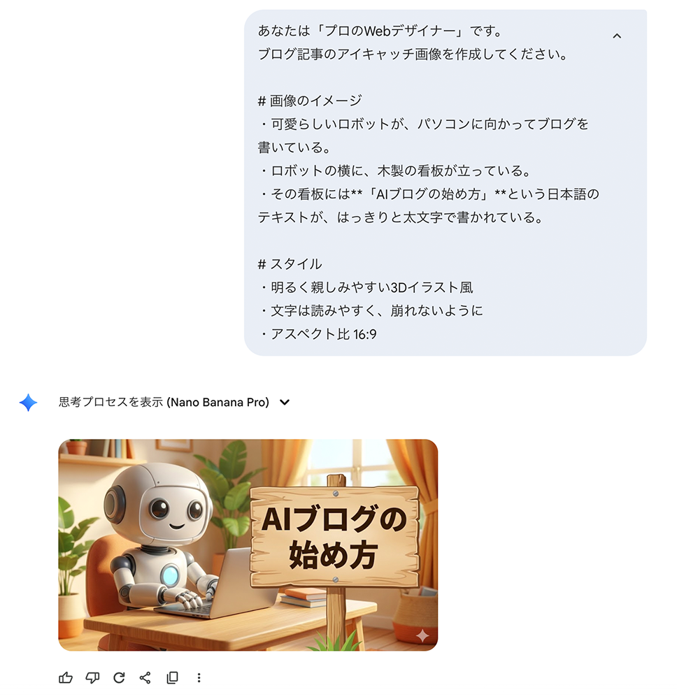これなら、わざわざCanvaを開いてフォントを選んで…ってしなくても、簡単なサムネイルならGeminiだけで完成しちゃいますよね。