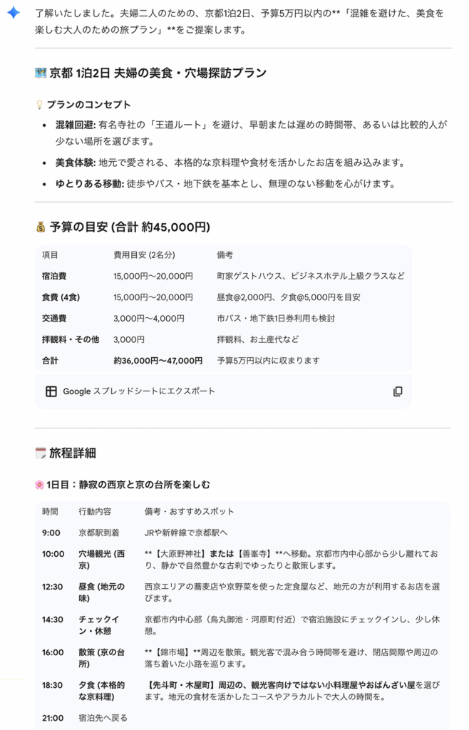これを入力してみたところ、Geminiは「#」で区切られた各項目を完璧に理解し、「-」で指定された細かい条件をすべてクリアしたプランを出力してくれました。